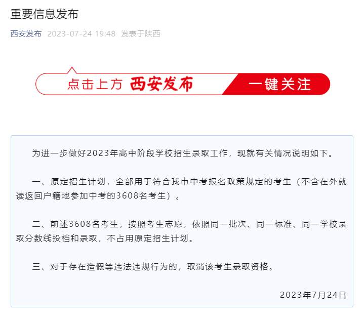 7月24日,西安发布微信公号发布消息:为进一步做好2023年高中阶段学校招生录取工作,现就有关情况说明如下。