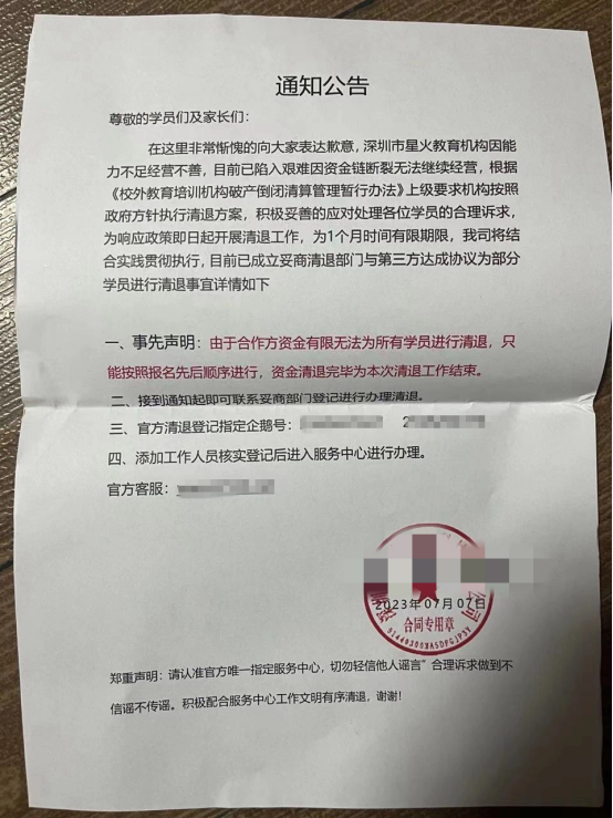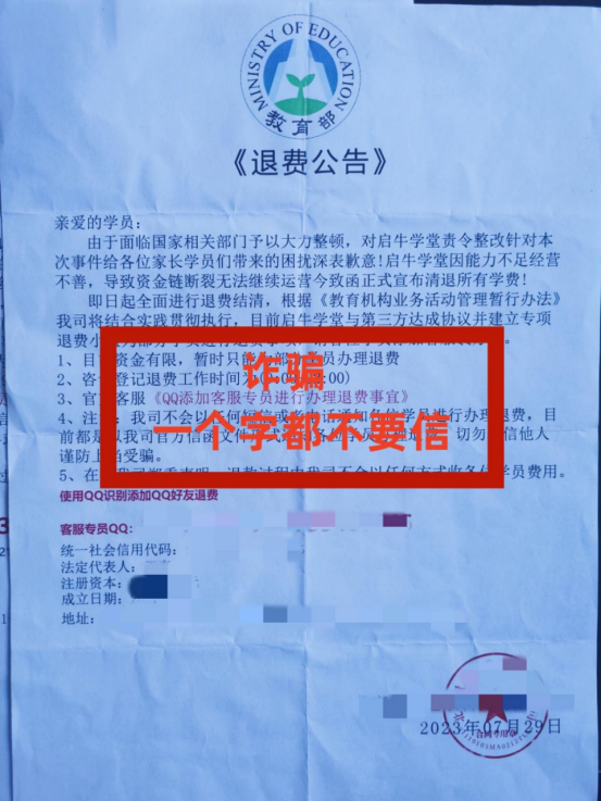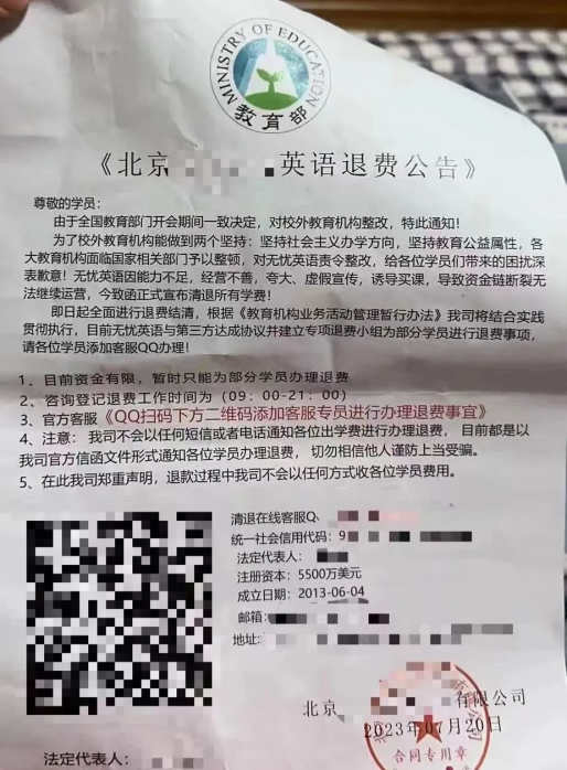 8月3日,江西省南昌市西湖区的王先生收到一份快递,里面有一张某英语机构的退费公告,称王先生曾经报名却迟迟未开班的培训机构可以办理退费,只需扫二维码联系客服,便可以办理。王先生扫码添加客服QQ好友后,被拉入了一个群聊。客服称,因该培训机构已被其他公司收购,办理退费首先需要购买该公司的债券,购买后才能把培训班的费用以及债券的费用一起返还。