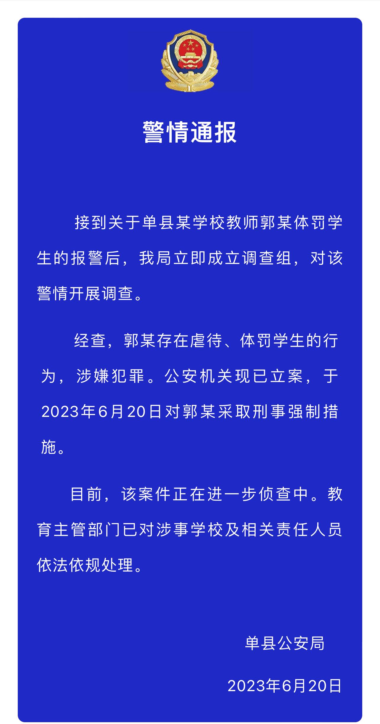 今日(20日),山东省菏泽市单县公安局发布关于单县某学校教师郭某体罚学生的警情通报。