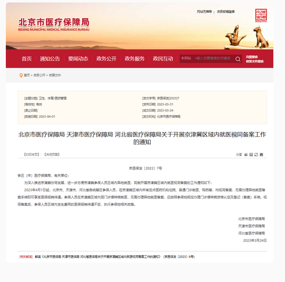 北京市医保局、天津市医保局、河北省医保局近日联合印发《关于开展京津冀区域内就医视同备案工作的通知》。详情如下: