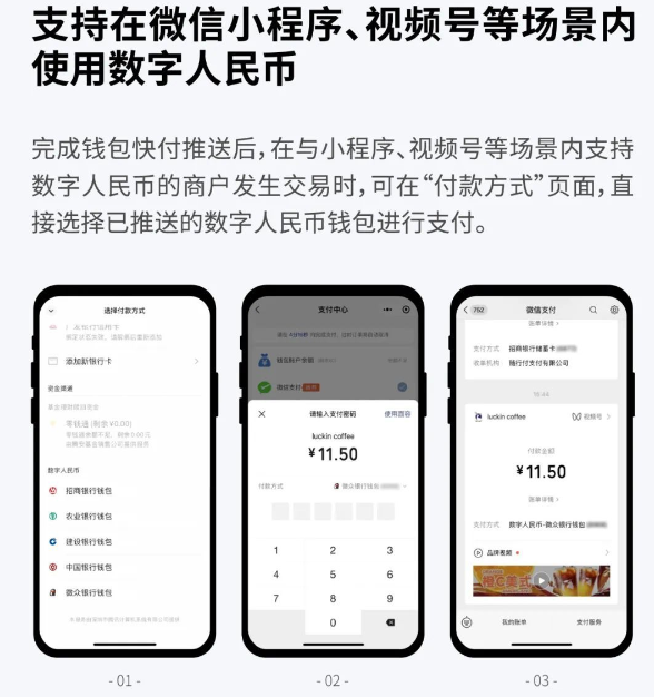 ▲4月26起,微信用户可以在“数字人民币”App内的钱包快付功能下开通“微信支付”,选择将任意运营机构的钱包推送到微信支付,就可在视频号、小程序场景内支持数字人民币的商家中使用数字人民币进行交易。详情