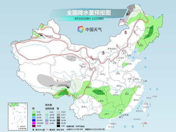 具体来看,中央气象台预计,今天,新疆沿天山地区、西藏东部、甘肃河西、川西高原北部、内蒙古东北部等地部分地区有小雪或雨夹雪,其中,新疆沿天山的高海拔地区、内蒙古东北部等地有中到大雪(5~8毫米)。东北地区中东部、西藏东南部、四川盆地西部、重庆大部、贵州中东部、湖南中南部、广西大部、广东中西部等地部分地区有小雨,其中,西藏东南部、重庆南部、吉林中部等地部分地区有中雨。