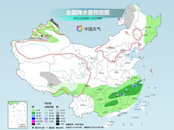 明天,新疆北疆北部和沿天山地区、内蒙古东北部、黑龙江西北部、西藏东部等地部分地区有小雪或雨夹雪,其中,新疆阿勒泰和沿天山的高海拔地区等地部分地区有中到大雪(5~9毫米)。东北地区东部、西藏东南部、西南地区东部、江汉东部、江淮大部、江南、华南大部等地部分地区有小到中雨,其中,安徽南部、湖南中部、江西中部、浙江北部等地局地有大雨(25~30毫米)。