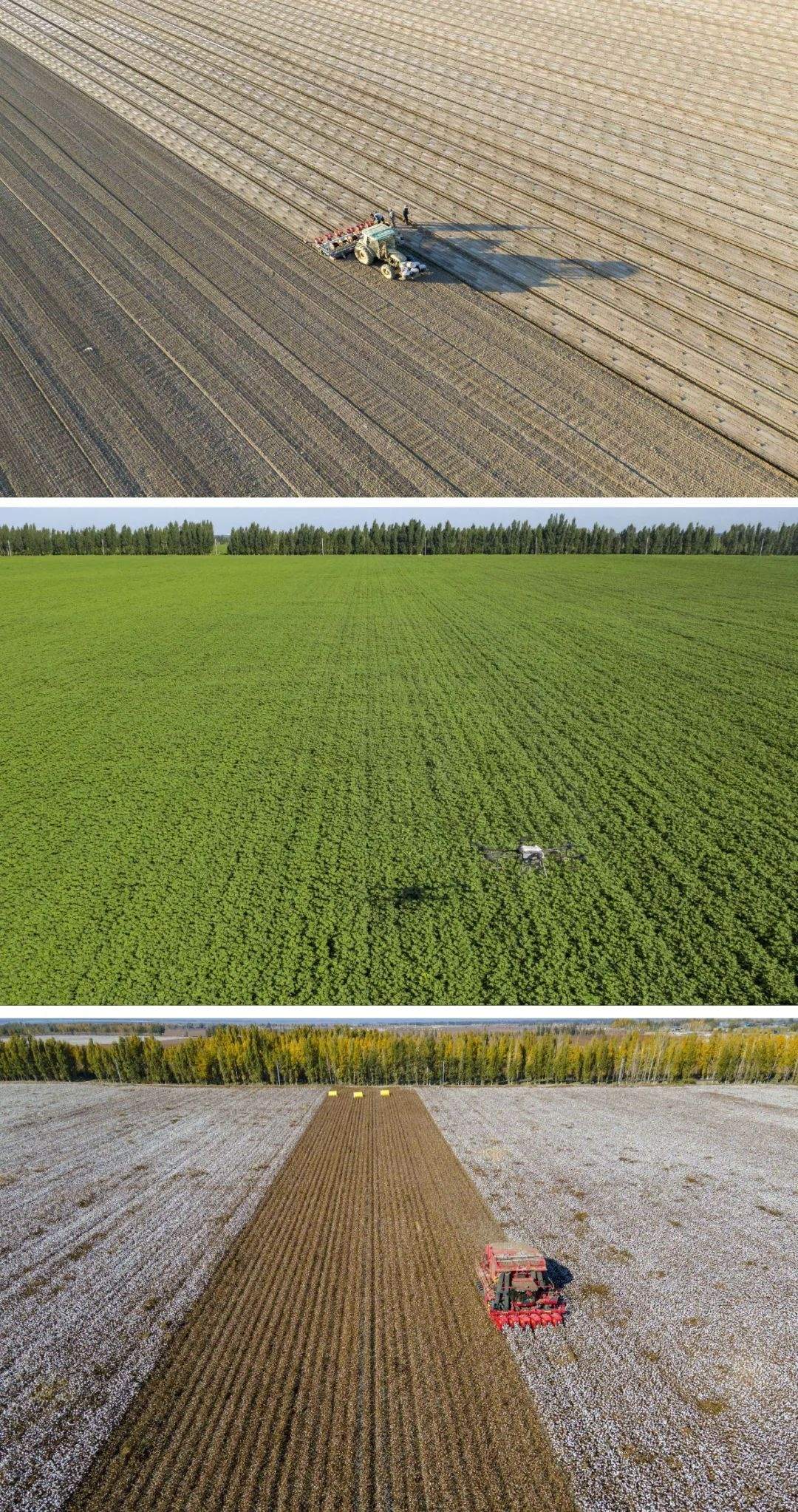资料图:从上至下,分别为在新疆北部棉区拍摄的同一块棉田的机械化春播、无人机打药、采棉机采收现场。新华社记者 胡虎虎 摄