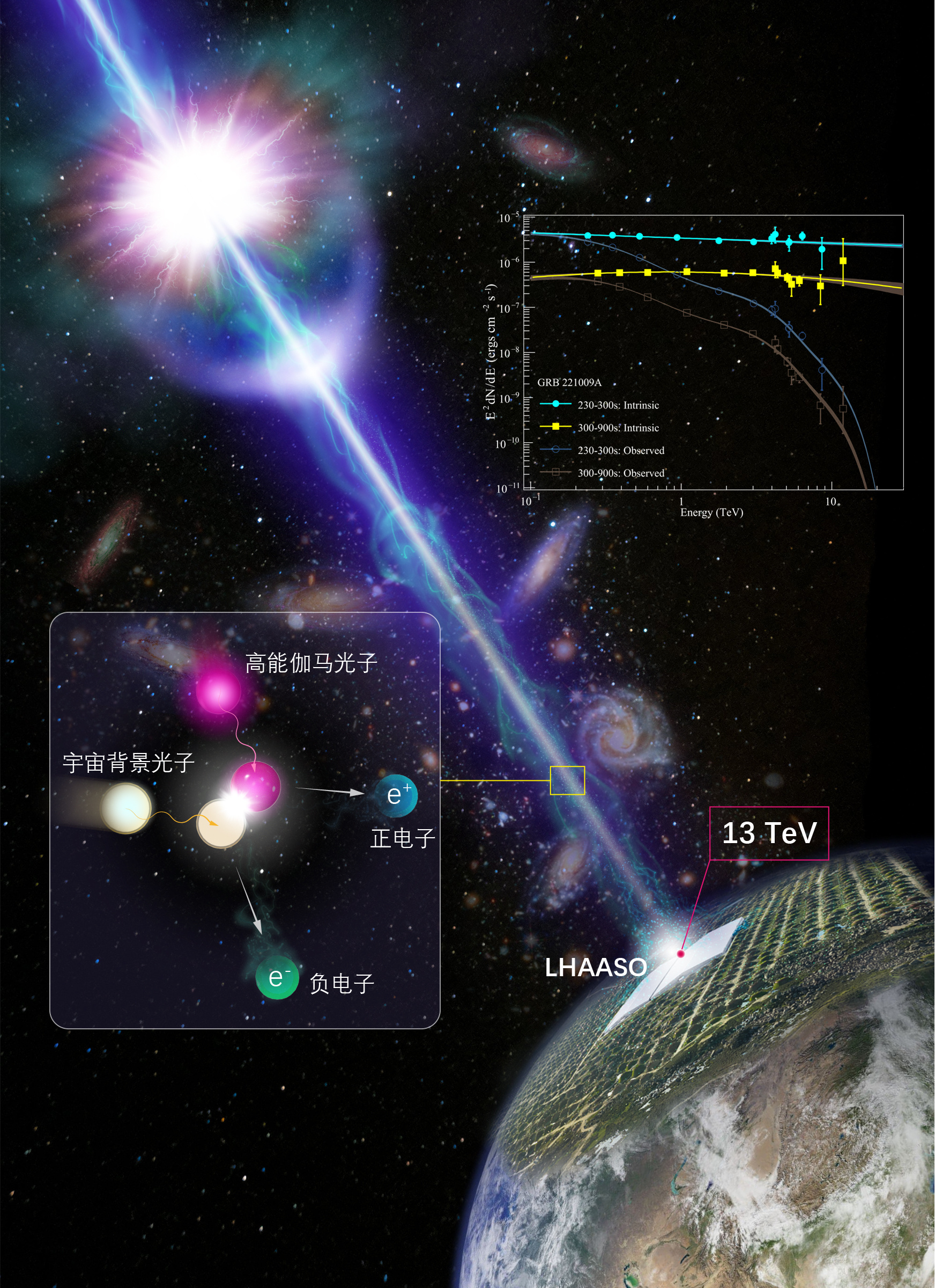 国家重大科技基础设施“高海拔宇宙线观测站(LHAASO)”(简称“拉索”)正式发布了迄今最亮的伽马射线暴(简称“伽马暴”,编号GRB 221009A)的高能伽马辐射的精确能谱,该结果挑战了传统的伽马暴余辉的标准辐射模型,揭示出宇宙背景光在红外波段强度低于预期。同时,该能谱为检验爱因斯坦相对论的适用范围、探索暗物质候选粒子——轴子等新物理研究方面提供了重要信息。相关结果于北京时间11月16日在《科学进展》(ScienceAdvances)上发表,由中国科学院高能物理研究所牵头的拉索国际合作组完成。