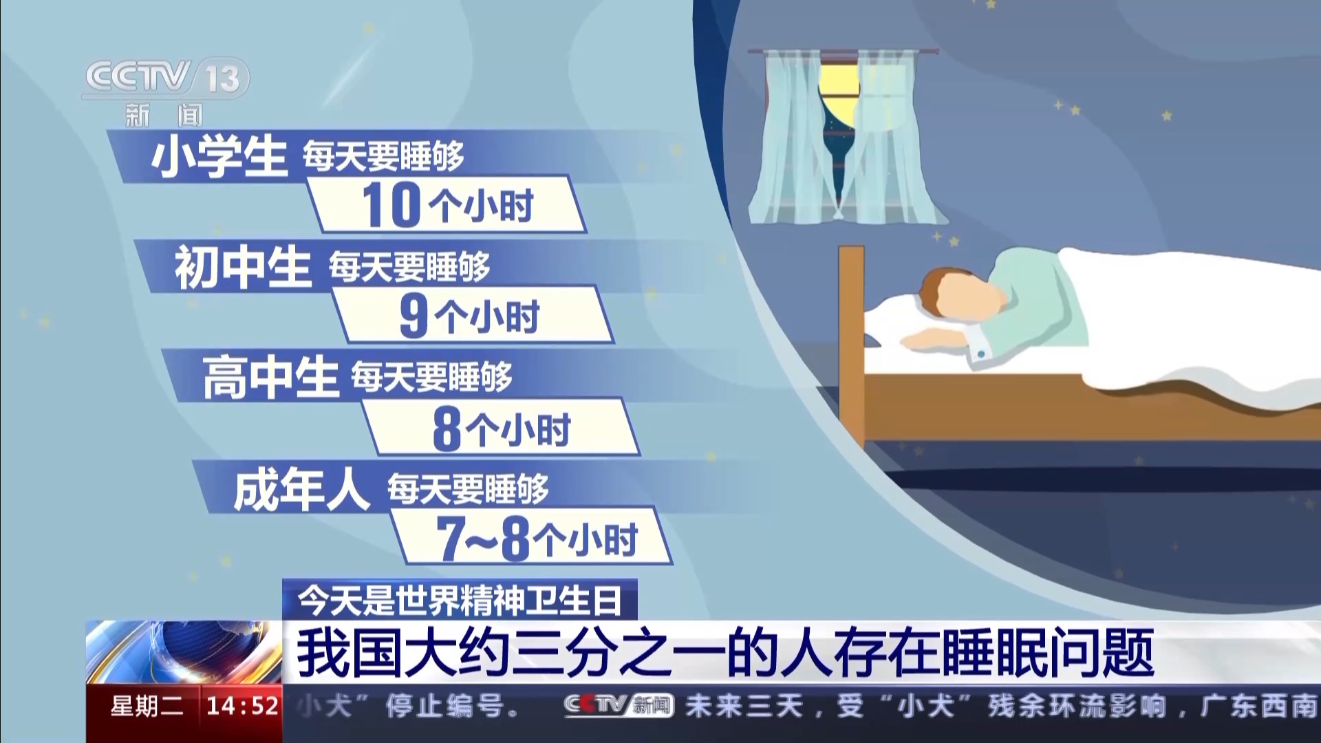 今天(10日)是世界精神卫生日。根据国际精神疾病诊断分类,睡眠障碍也属于精神疾病。在我国,大约三分之一的人有各种各样的睡眠问题。
