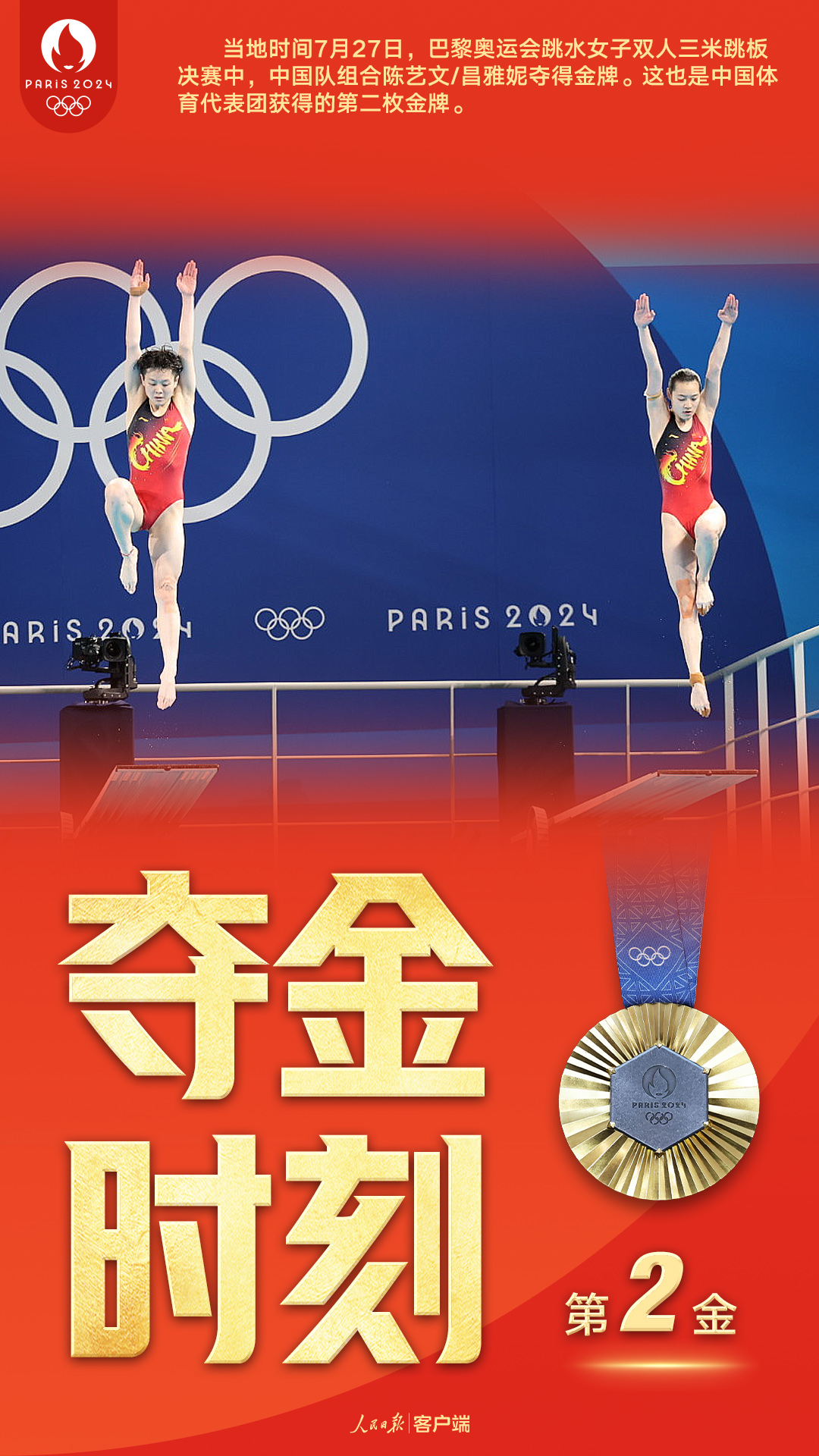当地时间7月27日,巴黎奥运会迎来开幕后首个比赛日。在巴黎水上运动中心刚刚结束的跳水女子双人三米跳板决赛中,中国队组合陈艺文/昌雅妮夺得金牌,帮助中国队实现该项目奥运六连冠。这是中国跳水队在本届奥运会上的首枚金牌,也是中国体育代表团获得的第二枚金牌。
