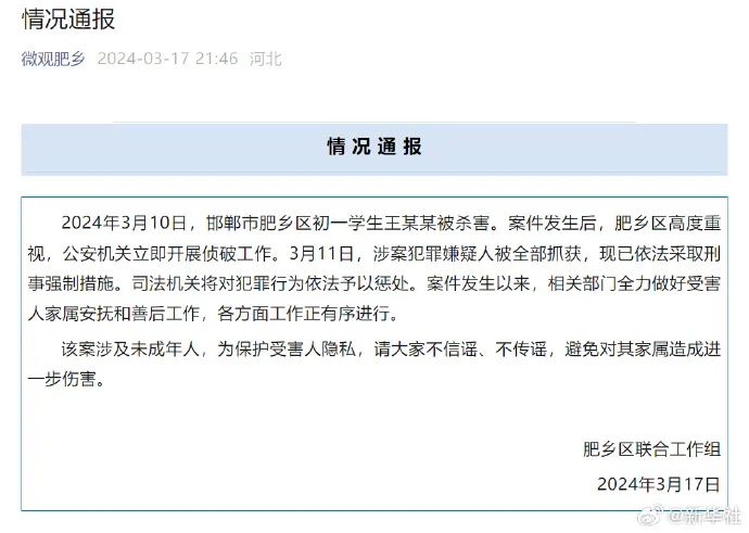 邯郸市肥乡区委员会宣传部的官方微信公众号“微观肥乡”17日晚间发布通报:2024年3月10日,邯郸市肥乡区初一学生王某某被杀害。案件发生后,肥乡区高度重视,公安机关立即开展侦破工作。3月11日,涉案犯罪嫌疑人被全部抓获,现已依法采取刑事强制措施。司法机关将对犯罪行为依法予以惩处。案件发生以来,相关部门全力做好受害人家属安抚和善后工作,各方面工作正有序进行。