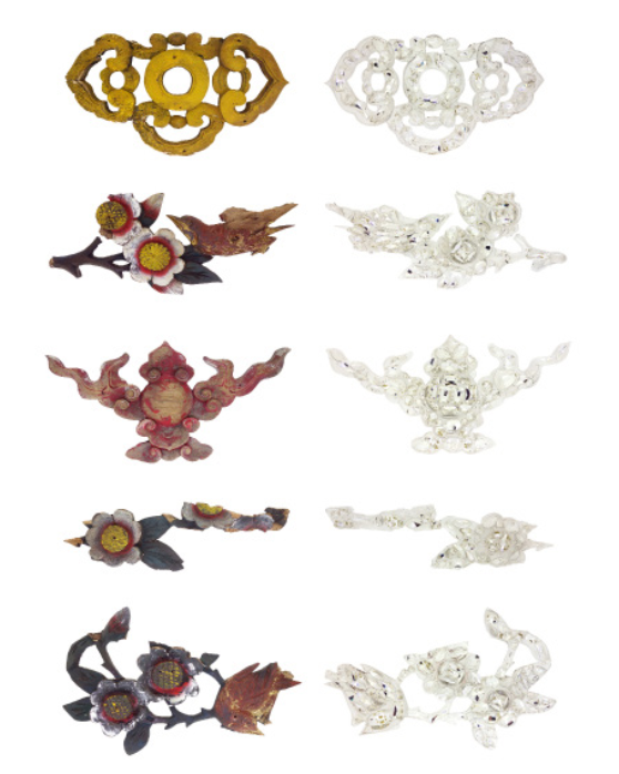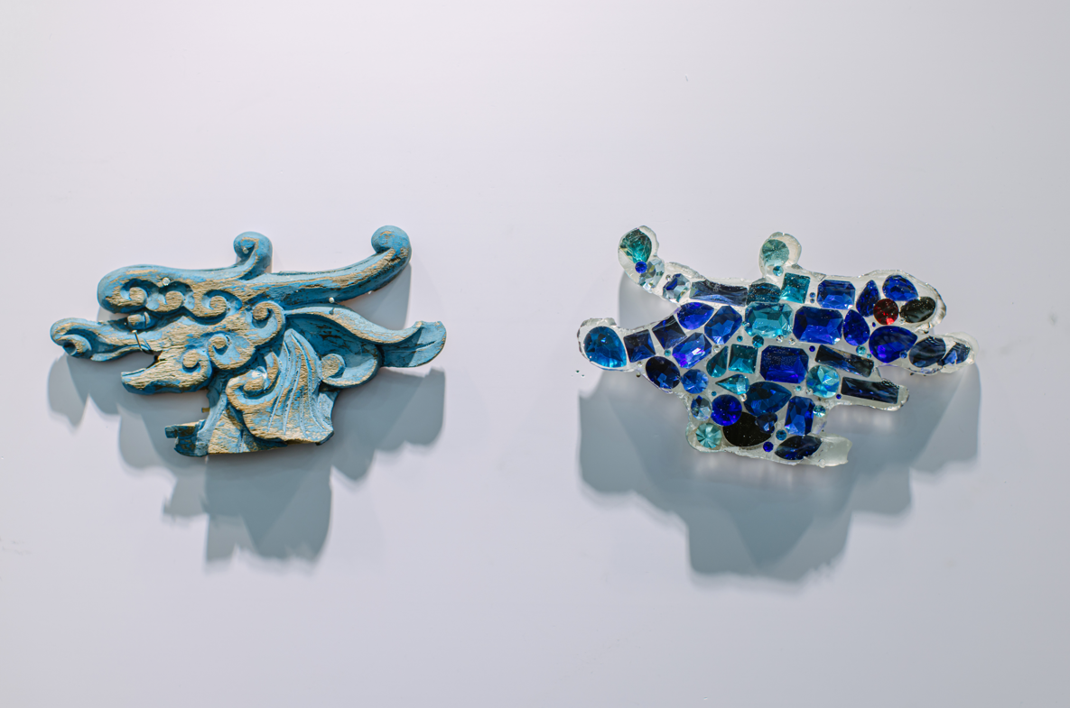 来自广东顺德的艺术家佘海晴说:“这些木雕来自我的家乡,都是从旧建筑掉落下来的。当时大家说这些掉了很可惜,但我觉得掉落的也是很美丽的艺术,值得永远的存在我们脑海中。我想赋予它新的生命,去呈现一种现代跟古往对话的感觉。”