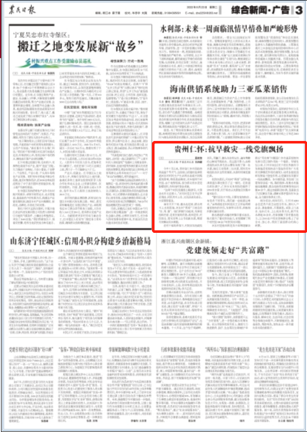 河东村党组织和党员干部帮助解决群众“用水难”问题是仁怀市基层党组织发挥示范引领作用的一个缩影。旱情发生以来,仁怀市发出《关于在抗旱救灾中发挥基层党组织战斗堡垒作用和广大党员先锋模范作用的通知》,动员各级党组织发挥战斗堡垒作用,让党旗在抗旱救灾一线高高飘扬。各乡镇街道、单位部门主要领导亲临一线、靠前指挥,收集水利基础设施薄弱、群众反映用水困难等突出问题40余个,通过加强联动协调,迅速拿出了切实解决方案,调解水事矛盾纠纷70余起,全力做好保供水工作。