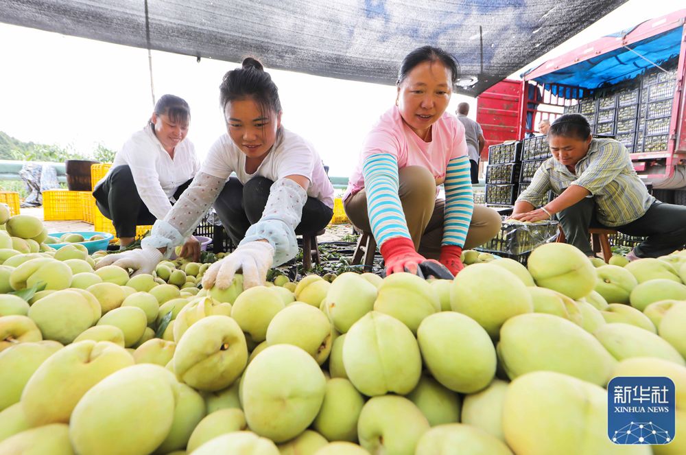 8月22日,村民在贵州省黔东南苗族侗族自治州岑巩县客楼镇下寨村分拣青桃。新华社发(罗慧 摄)