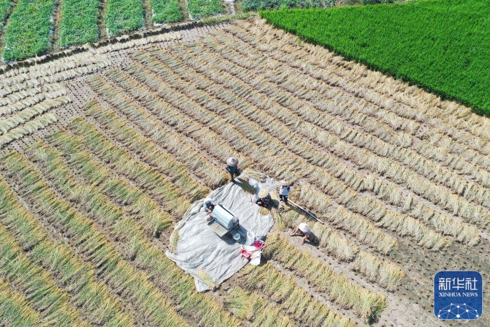 8月22日,在湖南省永州市道县营江街道白地头社区,村民在收获水稻(无人机照片)。新华社发(何红福 摄)