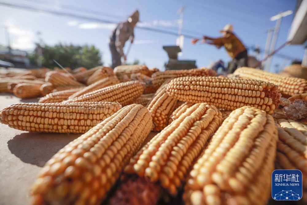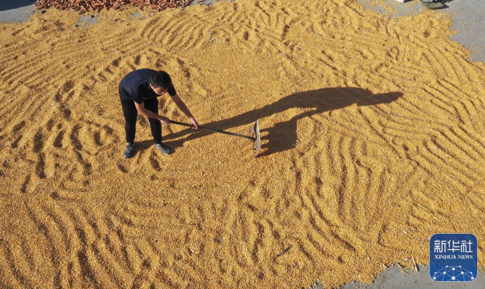 8月22日,河北省玉田县虹桥镇南会村村民在场院晾晒玉米。