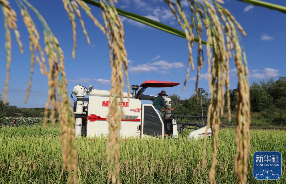 8月22日,湖南省衡阳市石鼓区角山镇村民驾驶农机收割中稻。