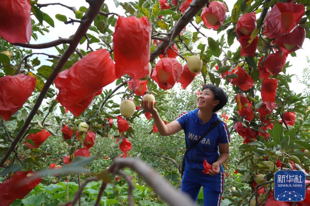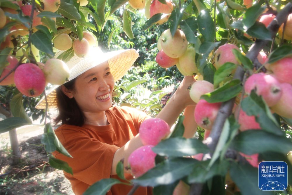 8月22日,河北省邢台市内丘县岗底村果农在果园里管护早熟苹果。
