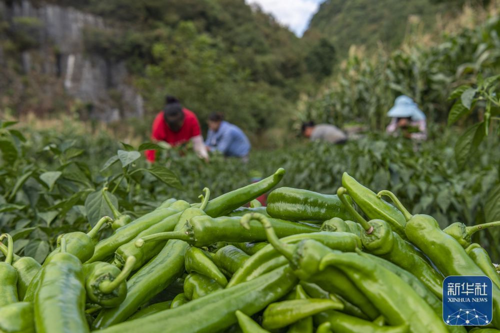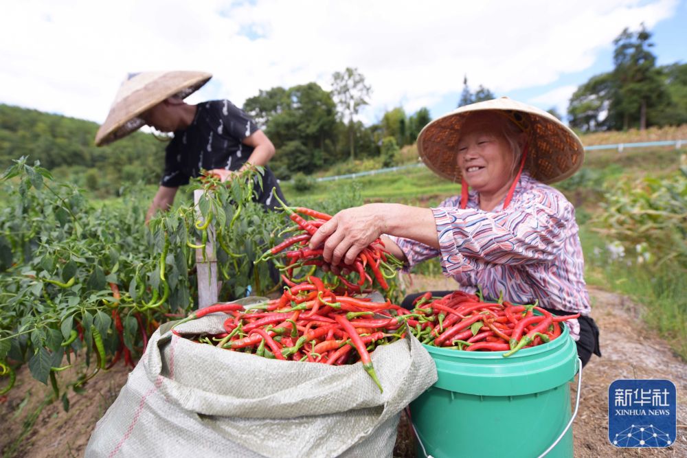 8月22日,村民在贵州省黔东南苗族侗族自治州岑巩县客楼镇丰坝村收获辣椒。新华社发(唐鹏 摄)