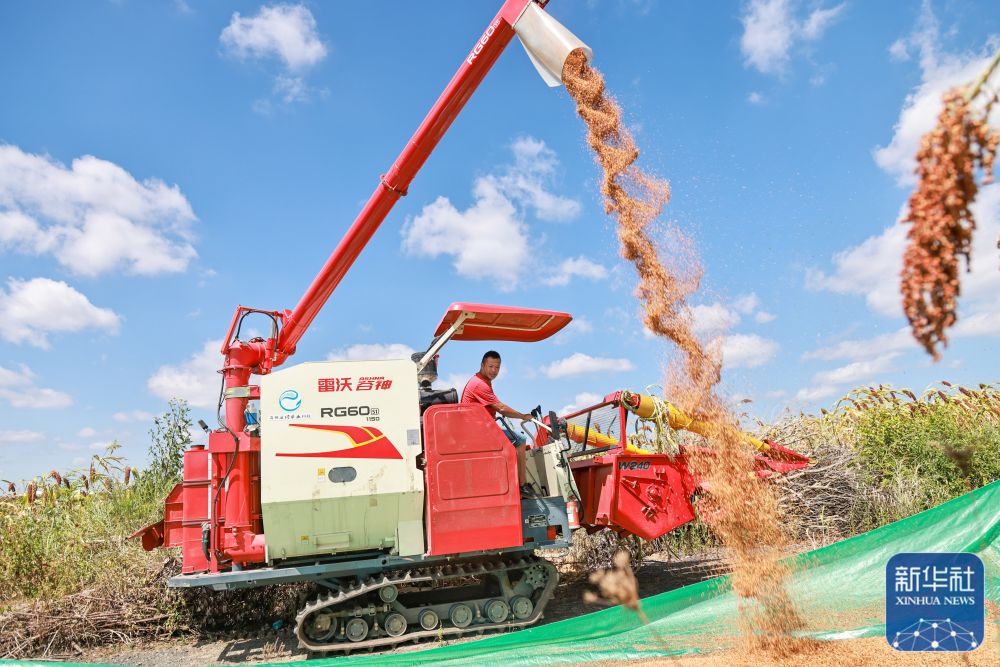 8月22日,在贵州省遵义市新蒲新区礼仪街道民主村,村民驾驶农机收割高粱。新华社发(简垦 摄)
