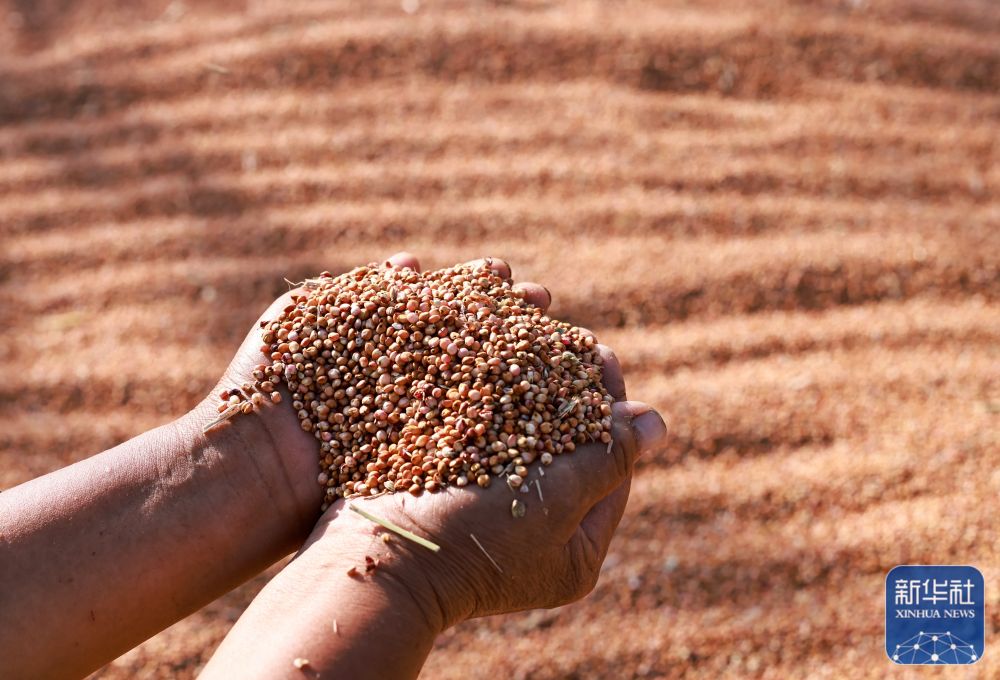 8月22日,在贵州省遵义市新蒲新区礼仪街道民主村,村民展示刚刚收获的高粱。新华社发(罗星汉 摄)