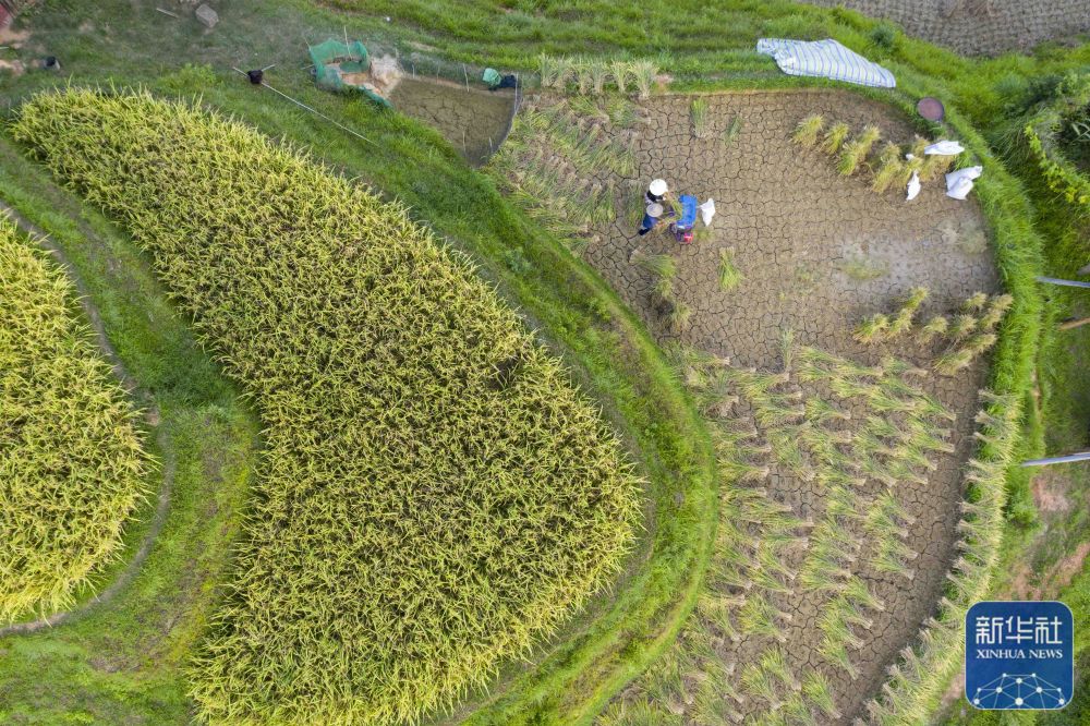 8月22日,贵州省黔东南苗族侗族自治州从江县丙妹镇岜沙村村民在收割稻谷(无人机照片)。新华社发(吴德军 摄)