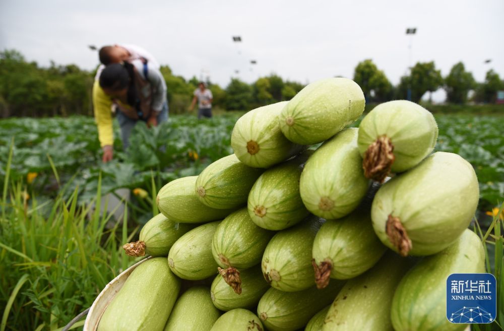 8月22日,在云南省丽江市古城区金山街道的农田里,农民在采摘西葫芦。