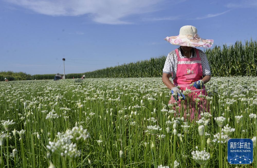 8月22日,河北省保定市望都县赵庄镇东张庄村农民在田间采摘韭菜花。