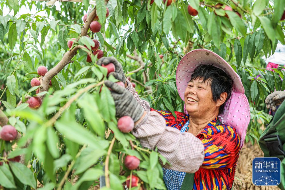 8月22日,在山东省荣成市石岛管理区一处枣油桃种植基地,果农在采摘枣油桃。新华社发(李信君 摄)