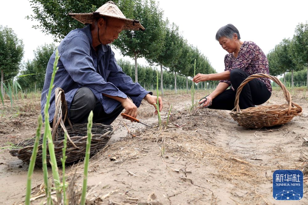 8月22日,山东省滨州市惠民县姜楼镇王判新村农民在采摘芦笋。