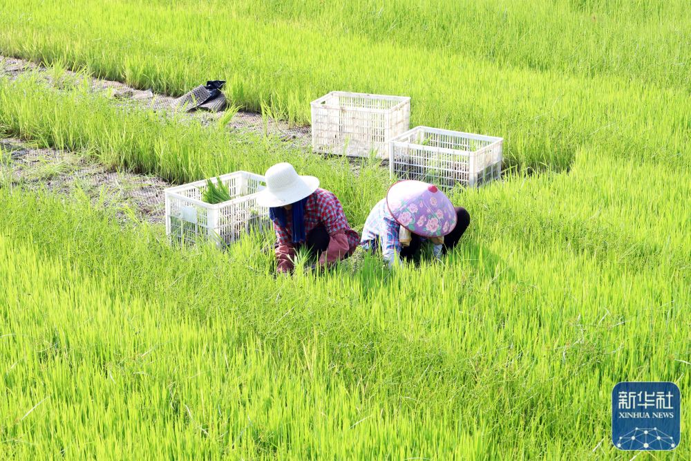 8月22日,在浙江省台州市路桥区横街镇田间,农民在晚稻秧苗地里劳作。