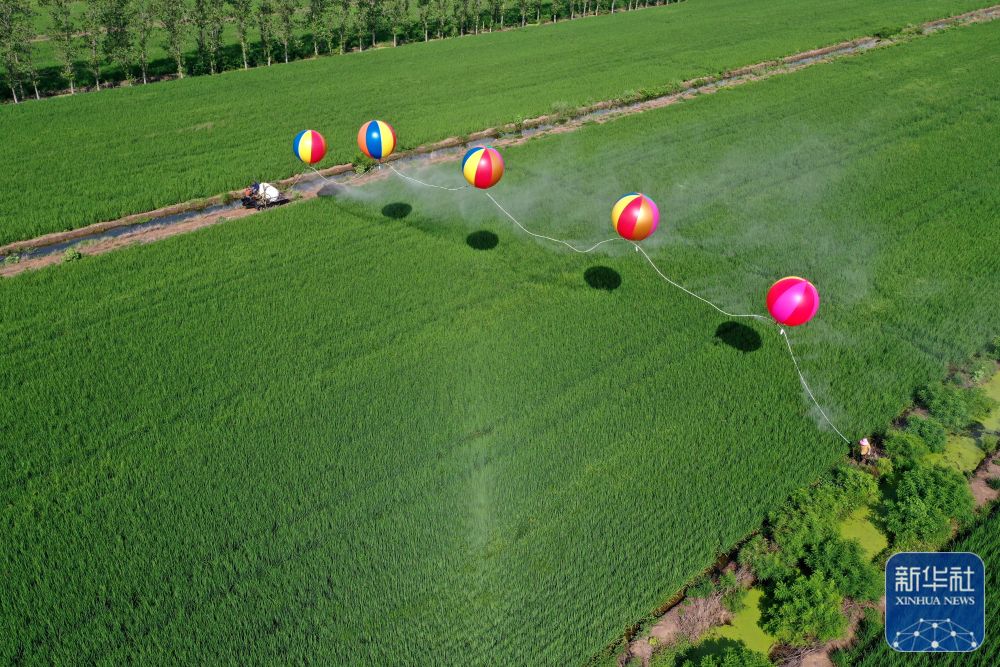8月22日,江苏省宿迁市泗洪县孙园镇水稻种植户利用“氢气球式”喷药机防治水稻病虫害(无人机照片)。新华社发(陈凯 摄)