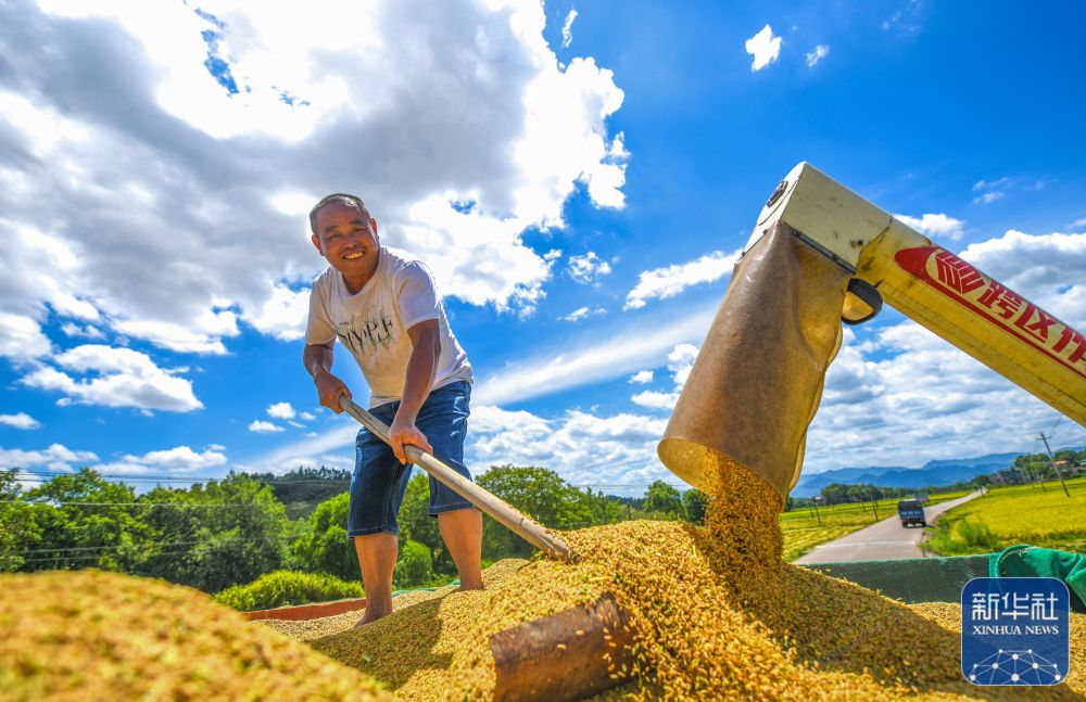 8月22日,在湖南省常宁市胜桥镇港子口村,农民将收获的稻谷装入转运车。
