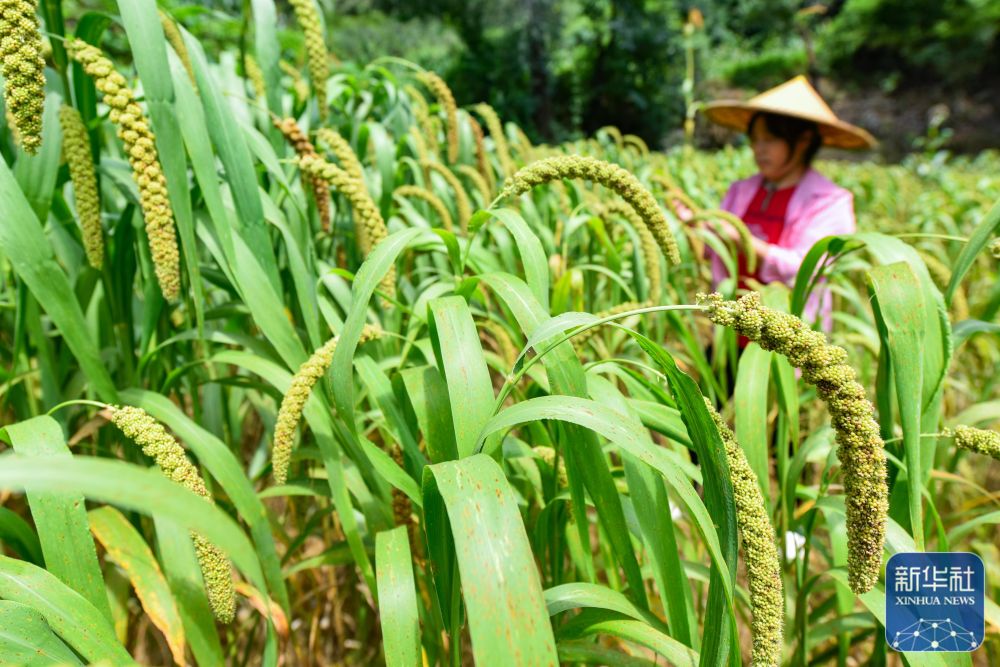 8月22日,在山东省青州市庙子镇一处农作物种植基地,农民在查看谷子成熟情况。新华社发(王继林 摄)