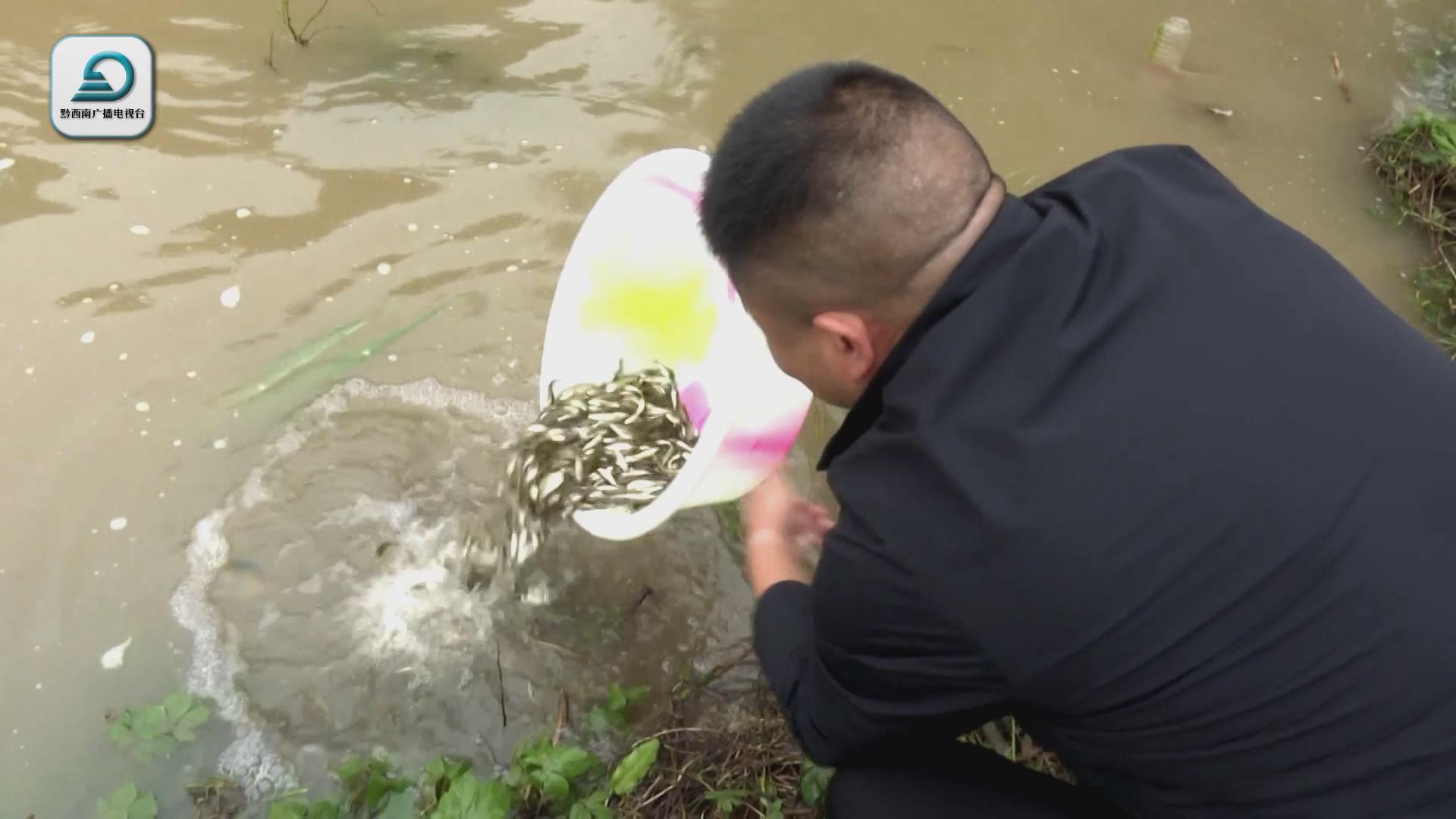 5月24日,普安县人民检察院办理的三起刑事附带民事公益诉讼案件的7名当事人在青山镇下节河履行增殖放流义务,将26000尾鱼苗放入河中,进行生态修复。