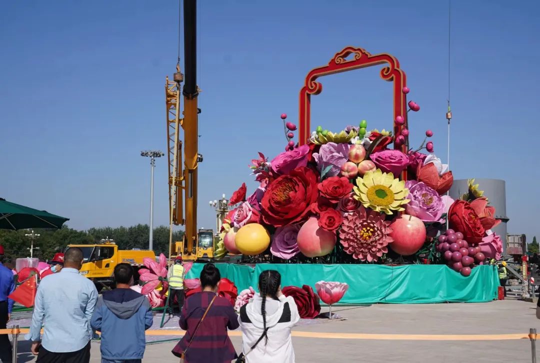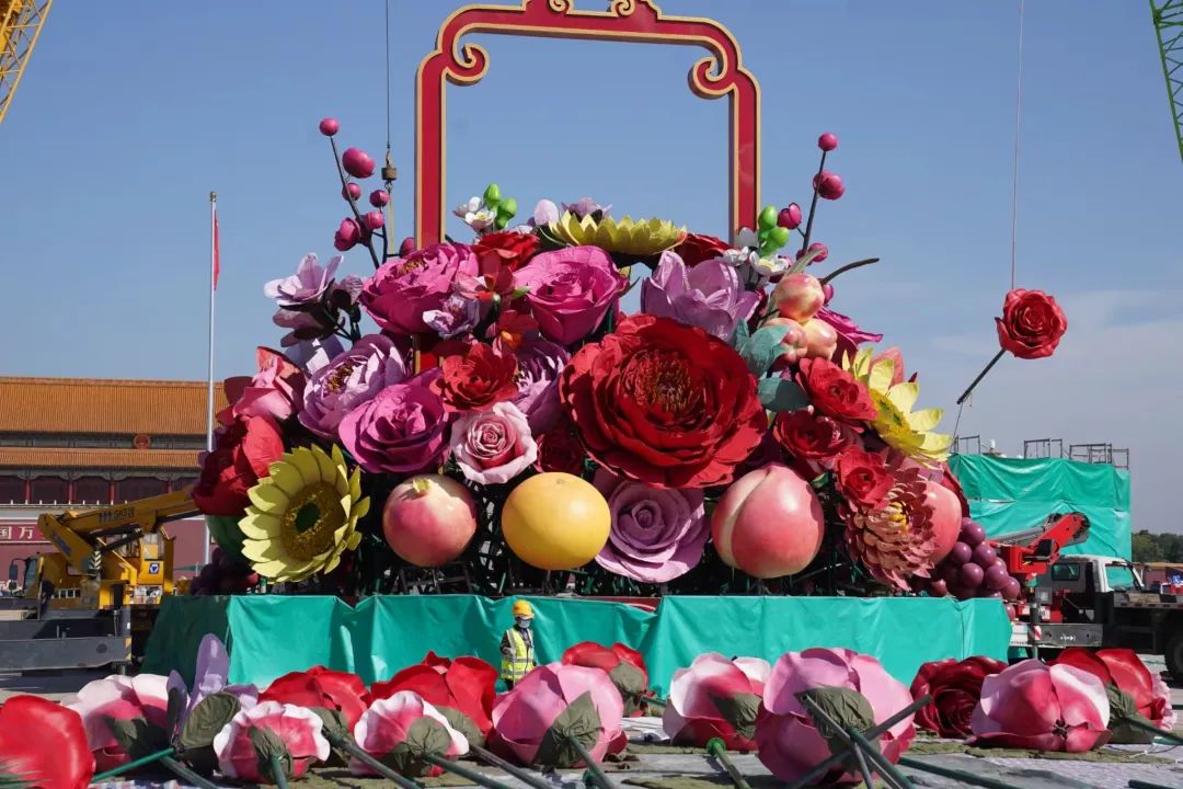 今天上午,记者在天安门广场看到,国庆主题大花篮正在搭建。