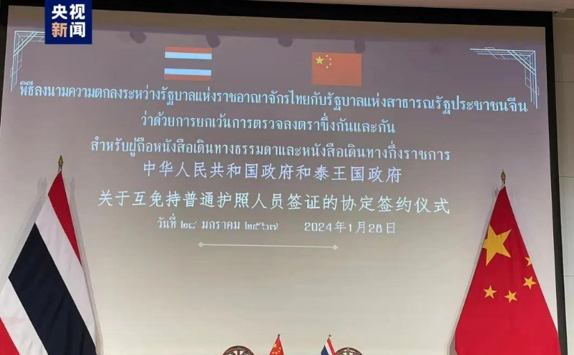 中华人民共和国政府与泰王国政府今天(28日)在曼谷举行关于互免持普通护照人员签证的协定签约仪式。该协定将从2024年3月1日起生效。