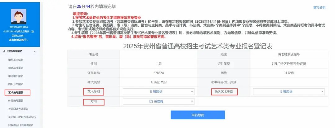 报考艺术类专业考试的考生,进入【我的高考报名】->【艺术统考报名】菜单,填报相关信息并网上缴费。