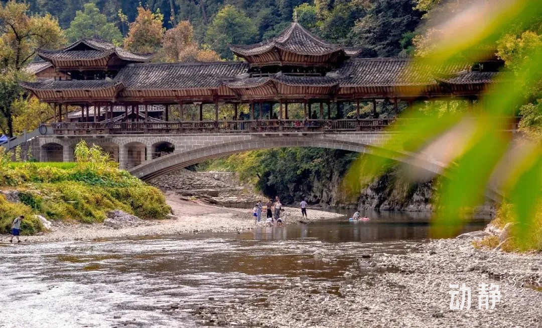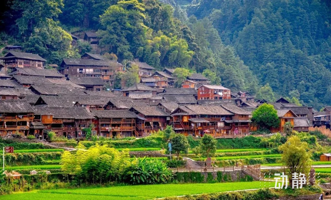 村寨四面群山环绕,村前有一条清澈见底的溪流,一座风雨木桥横跨溪流,水中群鸭嬉戏,两岸水车成行。