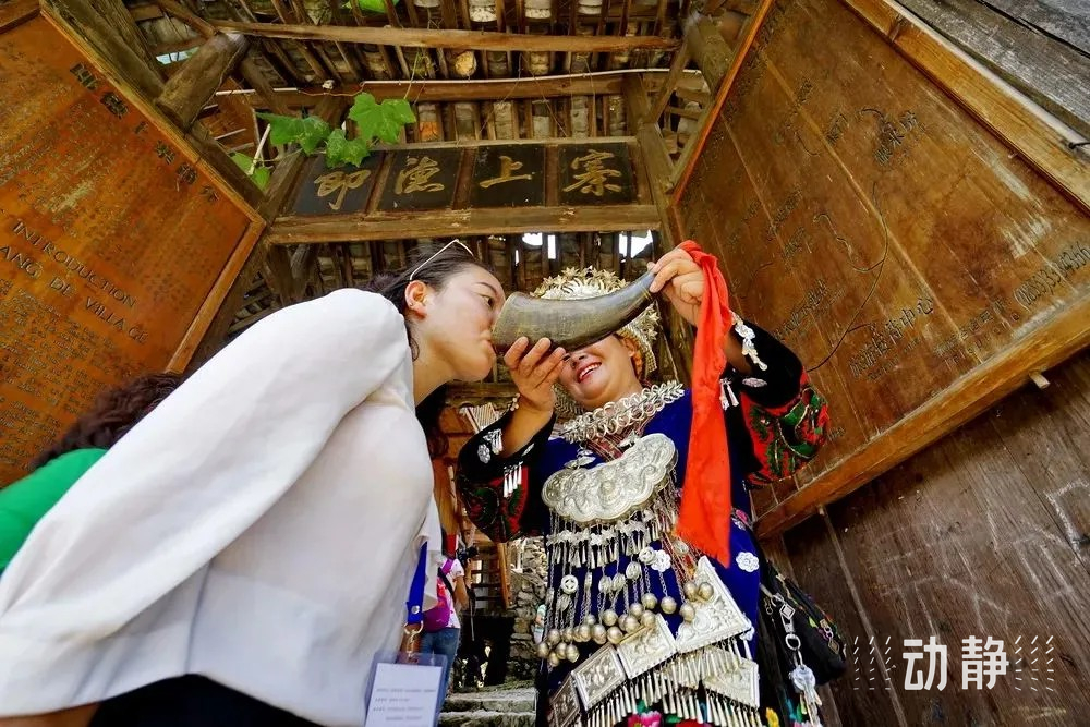 以酒待客是苗寨的习俗,只要有贵客到来,郎德上寨的村民们便会在村门口的田坎上摆设十二道“拦路酒”迎接宾客。