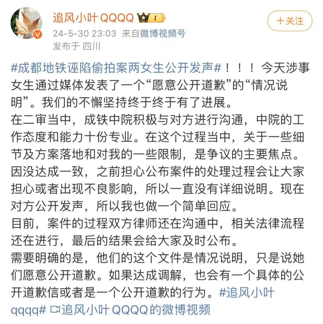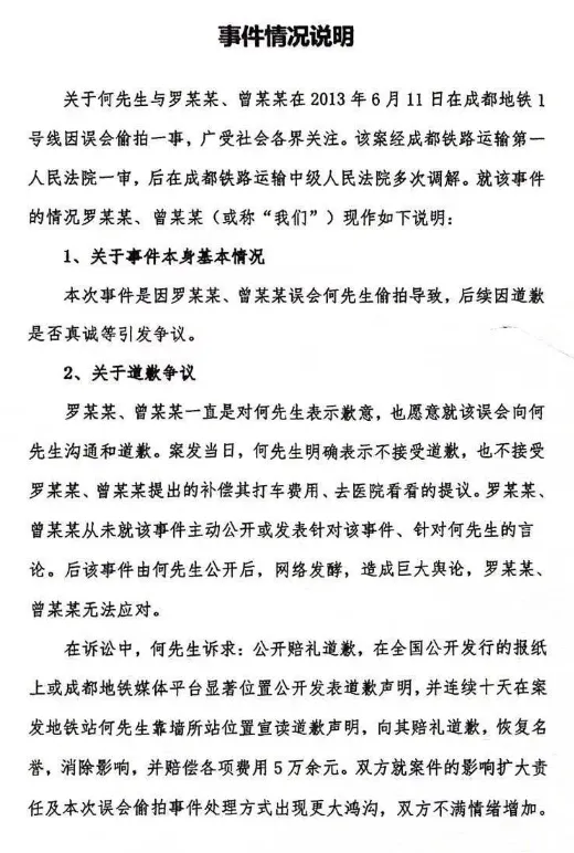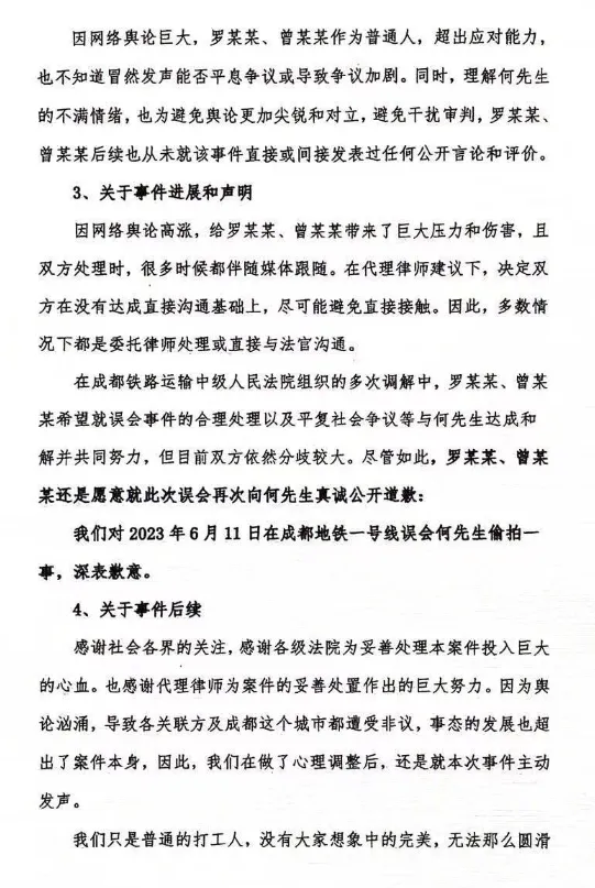 说明中表示:“尽管如此,罗某某、曾某某还是愿意就此次误会再次向何先生真诚公开道歉:我们对2023年6月11日在成都地铁一号线误会何先生偷拍一事,深表歉意。”