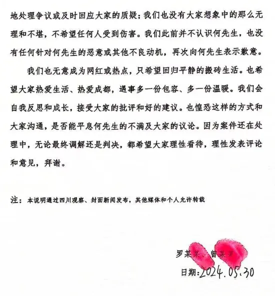 说明的最后,罗某某、曾某某说:“我们会自我反思和成长,接受大家的批评和好的建议。也惶恐以这样的方式和大家沟通,是否能平息何先生的不满及大家的议论。因为案件还在处理中,无论最终调解还是判决,都希望大家理性看待,理性发表评论和意见,拜谢。”