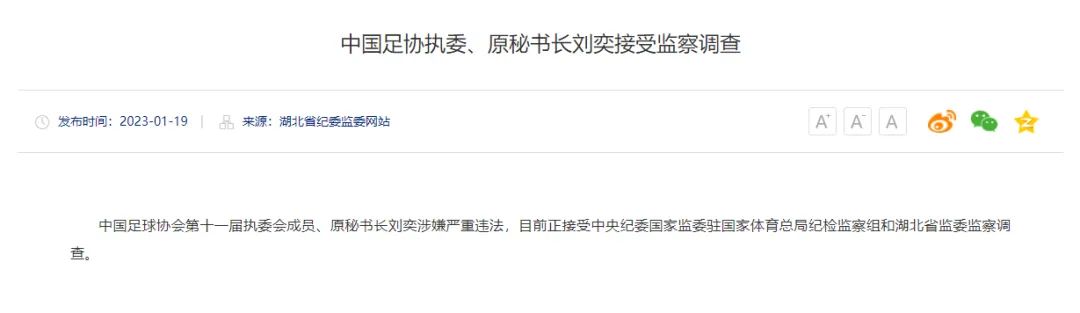中国足球协会第十一届执委会成员、原秘书长刘奕涉嫌严重违法,目前正接受中央纪委国家监委驻国家体育总局纪检监察组和湖北省监委监察调查。