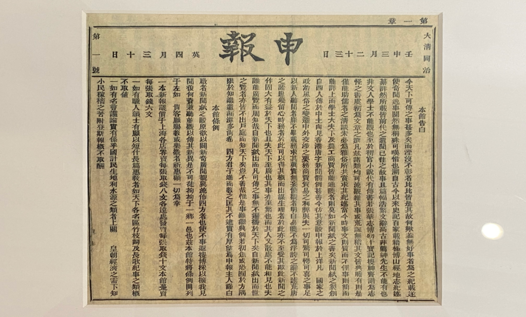 1872年4月30日(清同治年间),英国商人厄奈斯特·美查(Ernest Major)在上海创办。它是近代中国发行时间最久、最具社会影响力的报纸,历经晚清、北洋、民国三个时代,有中国近现代史“百科全书”之称。因其影响之广,上海及江南一带,人们将报纸统称“申报纸”。此创刊号为单面印刷,八版。版式特别,近正方形。