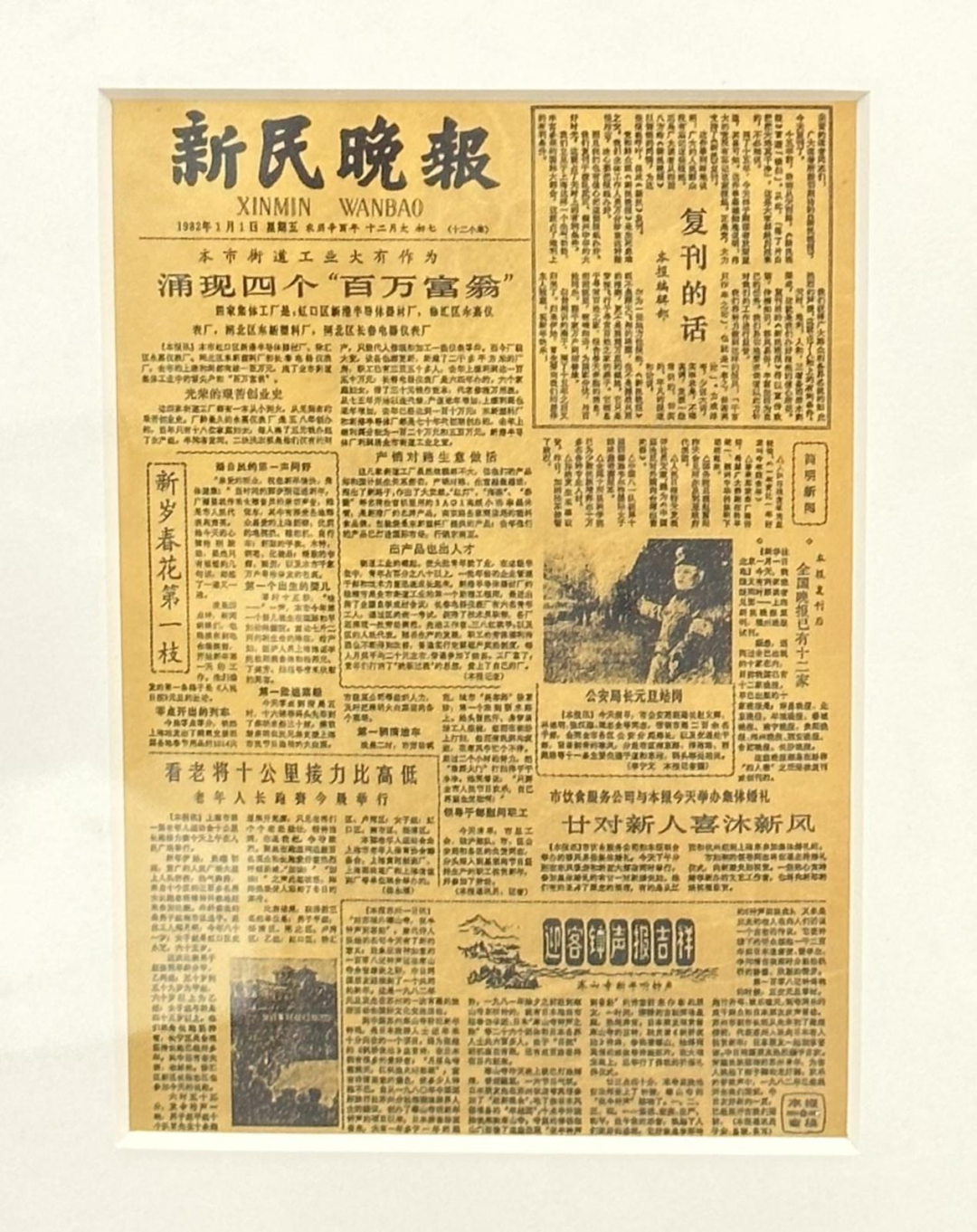 1929年9月9日创刊于南京,原名《新民报》。以服务百姓生活为宗旨,“飞入寻常百姓家”。此份金箔报由上海造币厂使用纯金金箔制造,刊印1982年1月1日《新民晚报》复刊后整版新闻,纪念创刊70周年。本期头条:上海4街道企业上缴利润突破100万元。