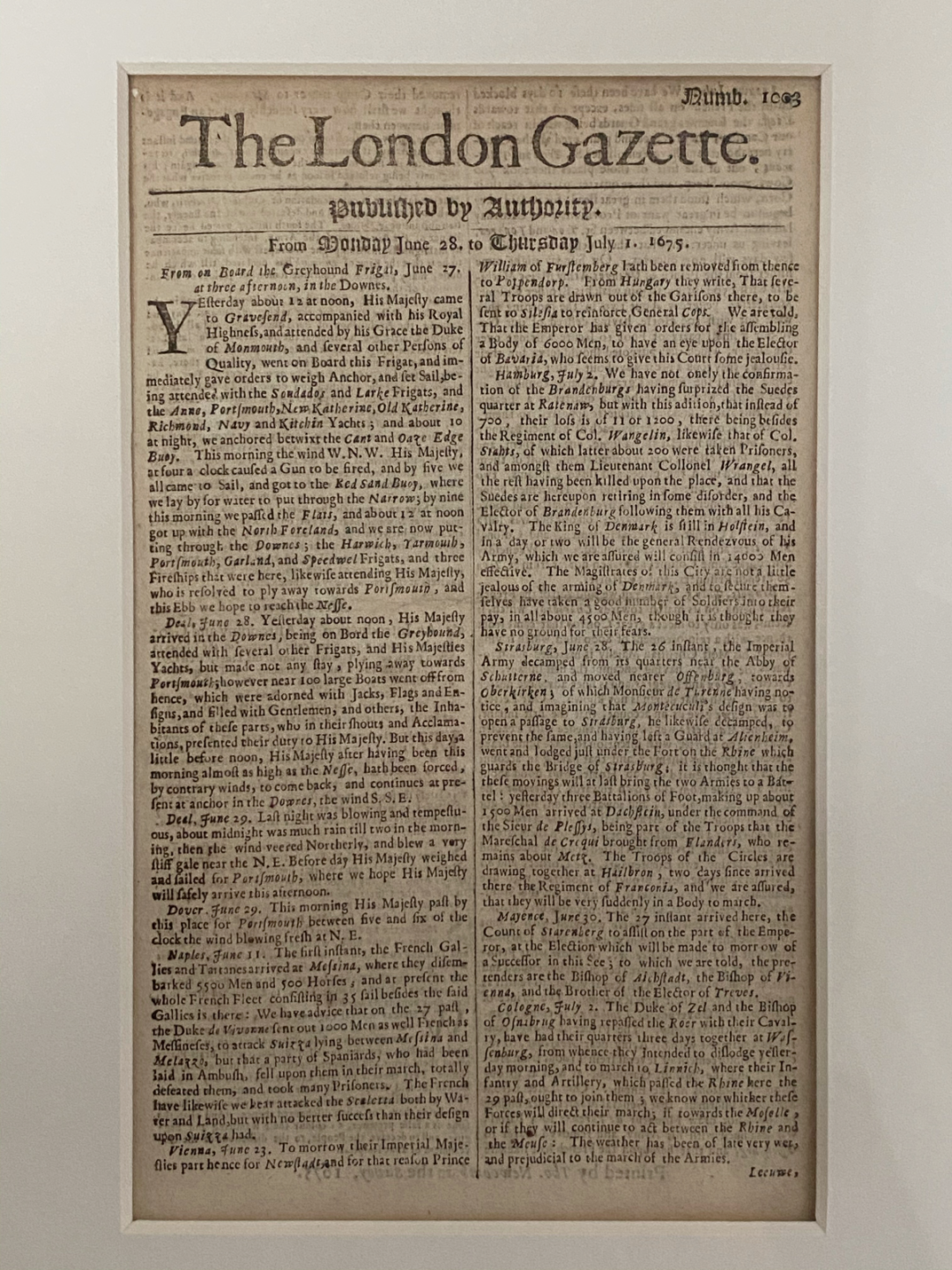 十七世纪英国官媒,英国历史上连续出版时间最悠久的报纸。单页双面,由英国文书局(The Stationery Office)承印,周一至周五出版。本期刊载了威斯敏斯特教堂失窃的消息,两个镀金烛台和一个刻有学院徽章的银盆被窃,提供破案线索者可获悬赏20英镑(赏格约为当时英国中产家庭的半年开支)。