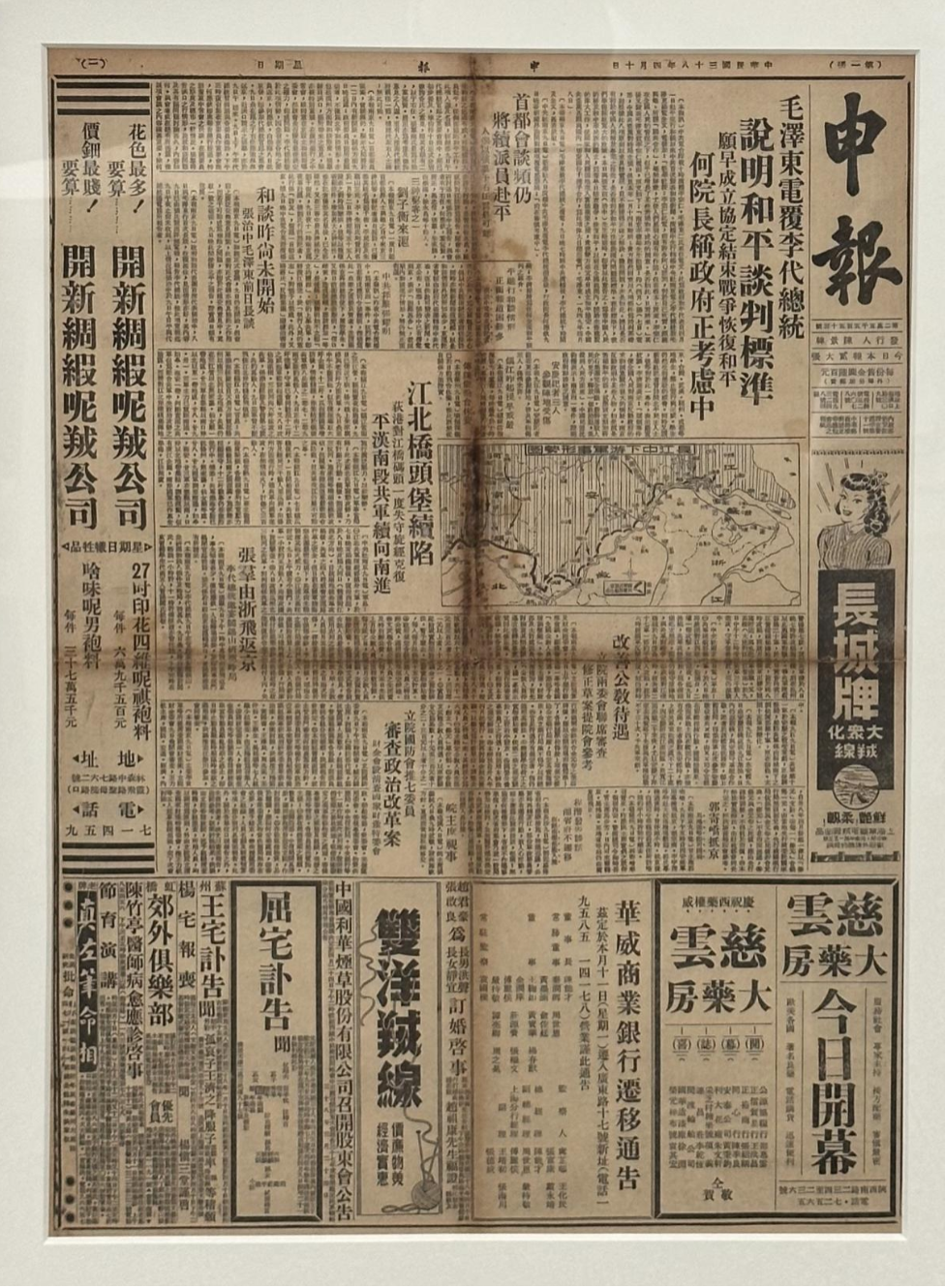 《申报》 1949年4月10日 上海汉口路“毛泽东电覆李代总统说明和平谈判标准”;“江北桥头堡沦陷”;“共军一路向前”及社会新闻若干。