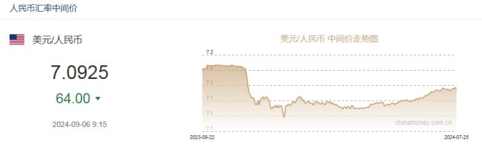据中国外汇交易中心网站消息,中国人民银行授权中国外汇交易中心公布,2024年9月6日银行间外汇市场人民币汇率中间价为:1美元对人民币7.0925元,上调64个基点。