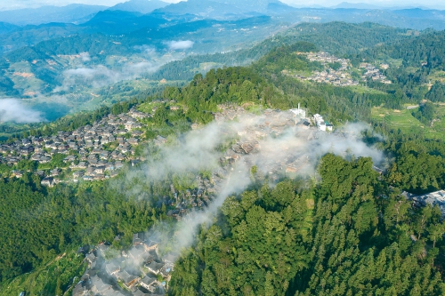 吴德军 摄 图为7月16日,从江县丙妹镇岜沙苗寨错落有致的民居与田园、青山、道路、蓝天白云等交相辉映,构成了一幅人与自然和谐共生的乡村画卷。