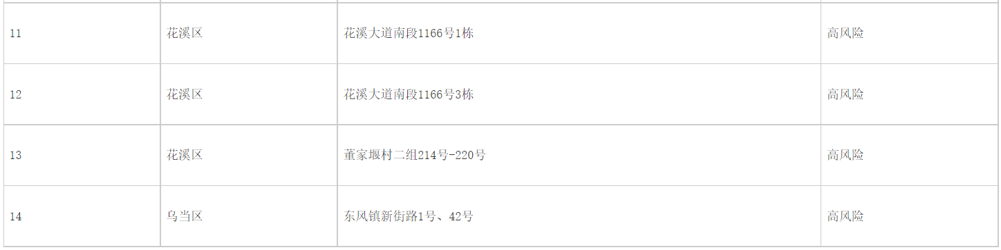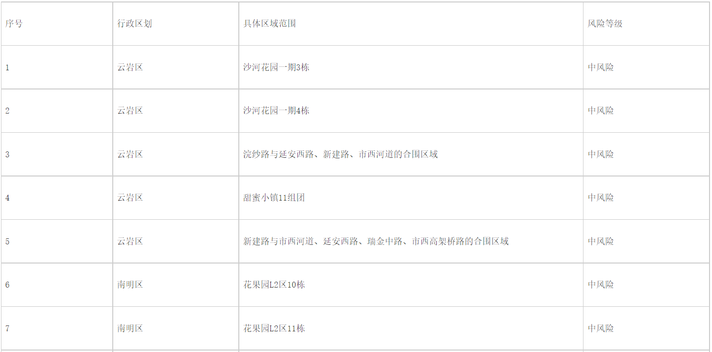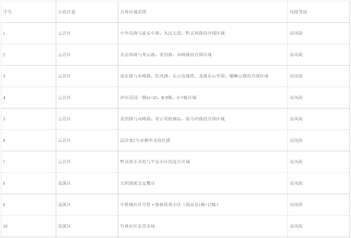 根据当前疫情防控形势,为快速有效阻断疫情传播,实现科学精准防控,切实保障辖区内群众生命安全和身体健康,逐步有序恢复正常生产生活秩序,按照《新型冠状病毒肺炎防控方案(第九版)》《贵阳市高风险区疫情防控攻坚指导方案》相关要求,经专家组研判,即日起,将云岩区中高风险区调整如下:
