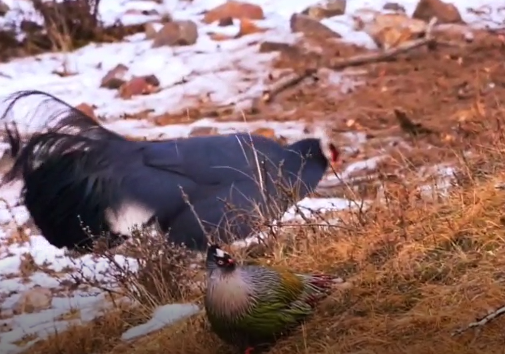 画面中,草原已呈金黄,偶见积雪。血雉和蓝马鸡同在一处觅食。