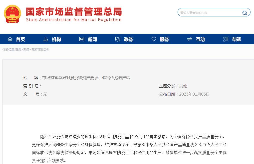 随着各地疫情防控措施的逐步优化细化,防疫用品和民生用品需求激增。为全面保障各类产品质量安全,更好保护人民群众生命安全和身体健康,维护市场秩序,根据《中华人民共和国产品质量法》《中华人民共和国标准化法》等法律法规规定,市场监管总局对防疫用品和民生用品生产、销售单位进一步落实质量安全主体责任提出六项要求。