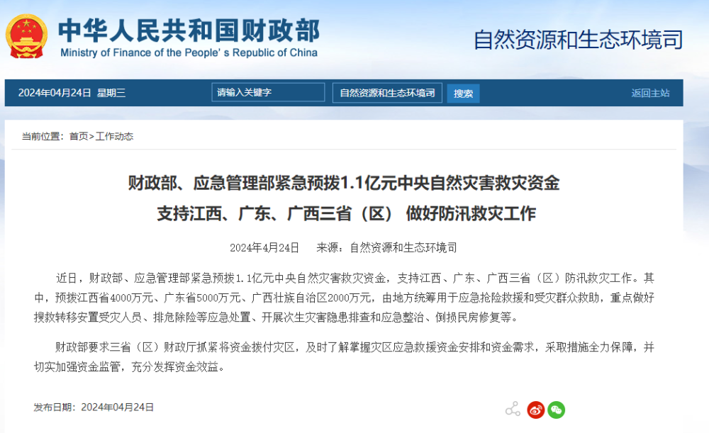 原标题:财政部、应急管理部紧急预拨1.1亿元中央自然灾害救灾资金 支持江西、广东、广西三省(区)做好防汛救灾工作